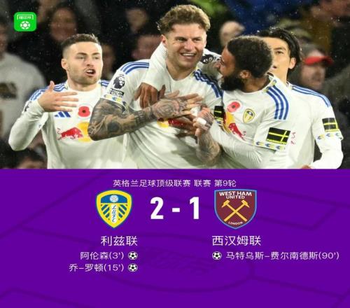 北京时间10月25日英格兰足球顶级联赛 联赛 第9轮,利兹联主场对阵西汉姆联。上半场,阿伦森闪击得分。随后,朗斯塔夫开出角球,乔-罗顿破门。下半场最后时刻,鲍恩传中,马特乌斯-费尔南德斯扳回一城。全场比赛结束,利兹联2-1战胜西汉姆联,铁锤帮则是遭遇英超连续6轮不胜。