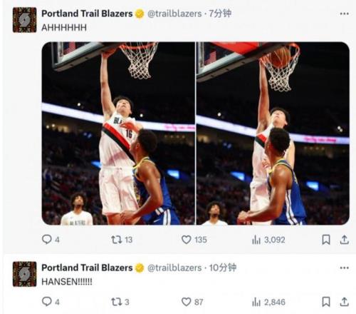 因此哪怕杨瀚森第二场仅出战7分14秒,并且大部分都是垃圾时间,在杨瀚森打进生涯首个运动战进球后,开拓者队官方还是一口气连发3条动态庆祝。