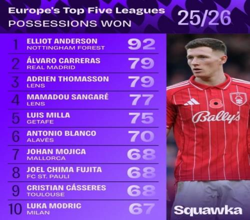 五大联赛战火即将重燃,数据机构squakwa也统计了本赛季至今的五大联赛球员赢得球权次数情况,诺丁汉森林中场埃利奥特·安德森居首。本赛季五大联赛赢得球权榜: