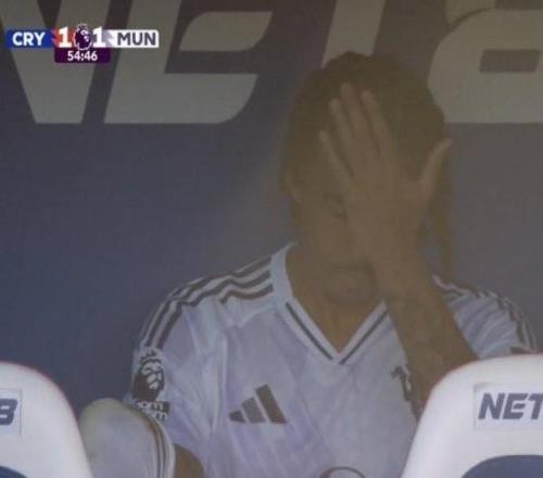 下半场第57分钟约罗被阿莫林换下,坐在替补席上的他神情十分沮丧,比赛结束之后戴着帽子准备离场,芒特一直在安慰他。