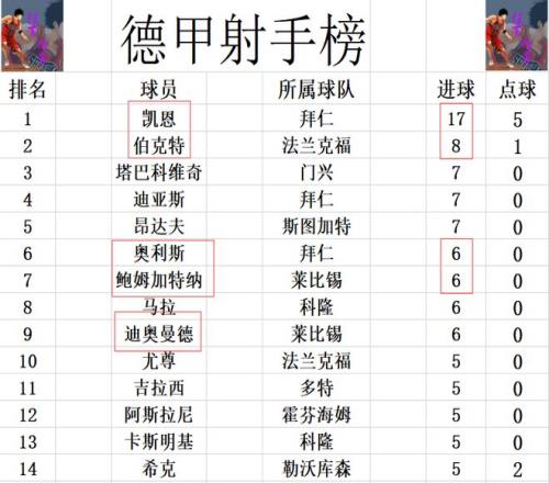 射手榜方面,凯恩上演帽子戏法,让德甲金靴越来越没有悬念,凯恩已经比第2的伯克特多了一倍还有剩的。迪亚斯,塔巴科维奇和昂达夫7球并列第3,迪奥曼德帽子戏法,鲍姆加特纳传射建功,两人追上奥利斯,马拉,6球并列第6。