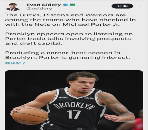 名记Sidery:勇士、雄鹿和活塞等队,已和篮网沟通过小波特的潜在交易......