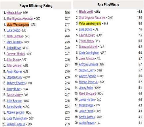 高阶数据方面,文班亚马本赛季的PER值是生涯最高的27.7,BPM则达到了+8.6,这两项全部排在联盟第三,仅次于约基奇和亚历山大,也能说明他的表现到底有多好。