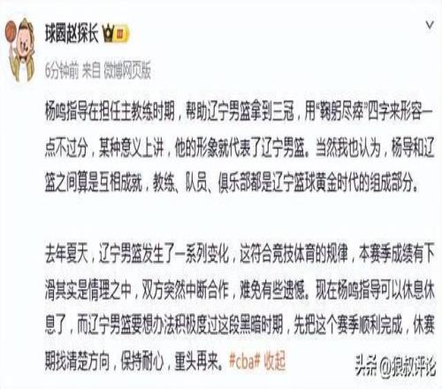 媒体人赵探长发文点评:杨鸣指导在担任主教练时期,帮助辽宁男篮拿到三冠,用“鞠躬尽瘁”四字来形容一点不过分,某种意义上讲,他的形象就代表了辽宁男篮。当然我也认为,杨导和辽篮之间算是互相成就,教练、队员、俱乐部都是辽宁篮球黄金时代的组成部分。