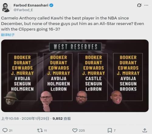 北京时间1月29日,TNT天团(奥尼尔、巴克利、肯尼-史密斯和厄尼-约翰逊)选择全明星西部替补,快船球员伦纳德0票。快船记者Farbod Esnaashari炮轰:“快船过去19场16胜3负,伦纳德是过去一个月联盟最佳球员,居然没人选他?”